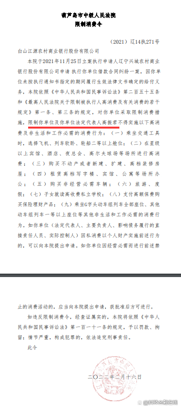 2月16日,吉林白山江源农商行被葫芦岛市中级法院列为失信被执行人,同时江源农商行及其法定代表人高振君被限制高消费行为,申请人为辽宁兴城农商行。