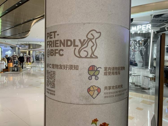 相较之下,BFC是此次记者走访的4家购物中心中唯一允许宠物进入室内区域的。且购物中心内共有约120个餐厅、商户承诺可以接待宠物,并竖起了专属的宠物友好标识。