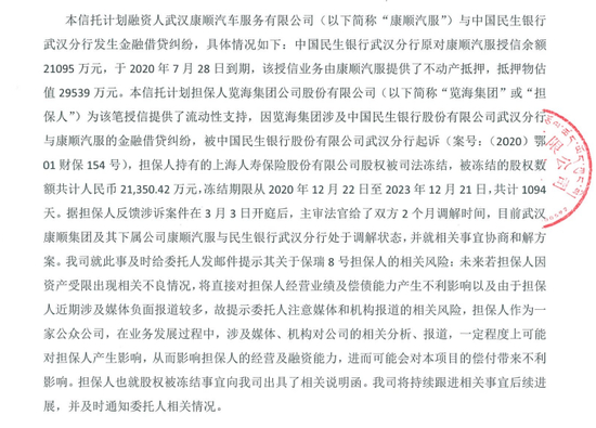 2021年4月份,西藏信托公布了两份共计18亿规模的信托计划风险提示。据了解,这两笔信托计划融资人武汉康顺汽车服务有限公司与民生银行武汉分行发生金融借贷纠纷。览海集团作为信托担保人被民生银行起诉,并被冻结其持有的上海人寿保险股份有限公司共计2.14亿元的股权,冻结期限从2020年12月22日至2023年12月21日,共计1094天。