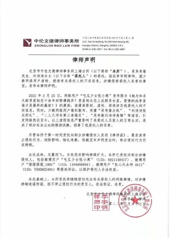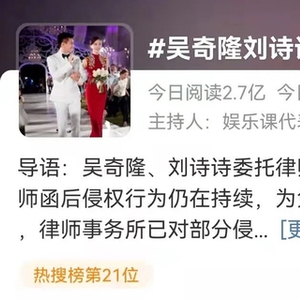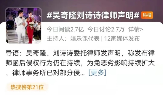 27日,吴奇隆刘诗诗夫妇委托律师发布声明,表示已经向虚构、捏造“刘诗诗吴奇隆离婚”“吴奇隆出轨”“刘诗诗败光彩礼”“二人之间有第三者插足”等谣言的网络用户提起诉讼,以维护合法权益。