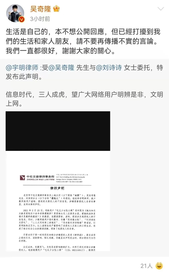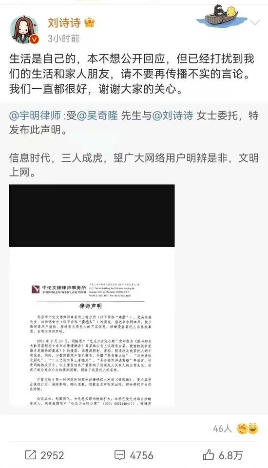 随后,吴奇隆、刘诗诗夫妇转发该声明,并配文:“生活是自己的,本不想公开回应,但已经打扰到我们的生活和家人朋友,请不要再传播不实的言论。我们一直都很好,谢谢大家的关心。”