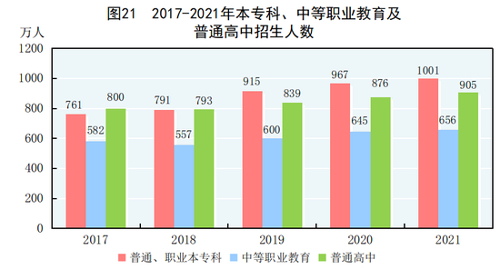 [65]普通、职业本专科包括普通本科、职业本科、高职(专科)。2021年高职(专科)招生人数统计口径发生变化,包含五年制高职转入专科招生人数。