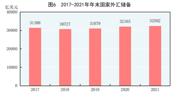 年末国家外汇储备32502亿美元,比上年末增加336亿美元。全年人民币平均汇率为1美元兑6.4515元人民币,比上年升值6.9%。