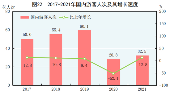 全年国内游客32.5亿人次,比上年增长12.8%。其中,城镇居民游客23.4亿人次,增长13.4%;农村居民游客9.0亿人次,增长11.1%。国内旅游收入29191亿元,增长31.0%。其中,城镇居民游客花费23644亿元,增长31.6%;农村居民游客花费5547亿元,增长28.4%。