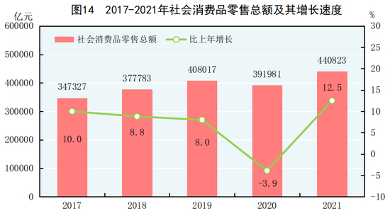 全年社会消费品零售总额440823亿元,比上年增长12.5%。按经营地统计,城镇消费品零售额381558亿元,增长12.5%;乡村消费品零售额59265亿元,增长12.1%。按消费类型统计,商品零售额393928亿元,增长11.8%;餐饮收入额46895亿元,增长18.6%。