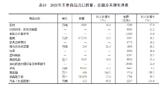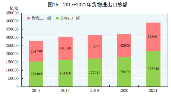 全年货物进出口总额391009亿元,比上年增长21.4%。其中,出口217348亿元,增长21.2%;进口173661亿元,增长21.5%。货物进出口顺差43687亿元,比上年增加7344亿元。对“一带一路”[44]沿线国家进出口总额115979亿元,比上年增长23.6%。其中,出口65924亿元,增长21.5%;进口50055亿元,增长26.4%。