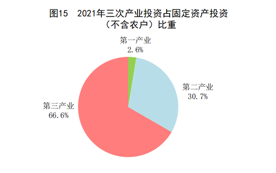 在固定资产投资(不含农户)中,第一产业投资14275亿元,比上年增长9.1%;第二产业投资167395亿元,增长11.3%;第三产业投资362877亿元,增长2.1%。民间固定资产投资[40]307659亿元,增长7.0%。基础设施投资[41]增长0.4%。社会领域投资[42]增长10.7%。