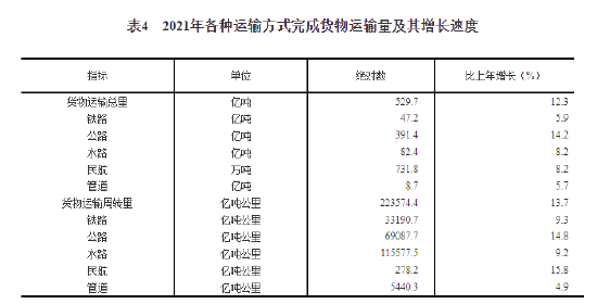 表4 2021年各种运输方式完成货物运输量及其增长速度