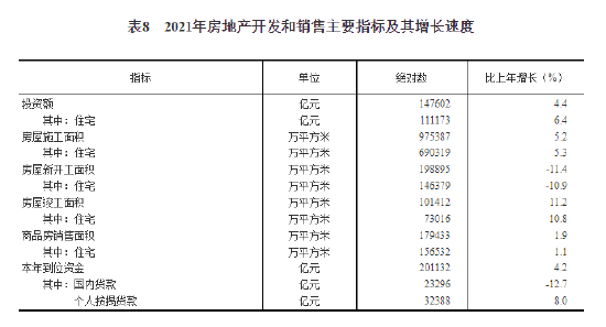 全年房地产开发投资147602亿元,比上年增长4.4%。其中住宅投资111173亿元,增长6.4%;办公楼投资5974亿元,下降8.0%;商业营业用房投资12445亿元,下降4.8%。年末商品房待售面积51023万平方米,比上年末增加1173万平方米,其中商品住宅待售面积22761万平方米,增加381万平方米。