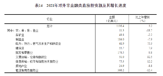 全年对外非金融类直接投资额7332亿元,比上年下降3.5%,折1136亿美元,增长3.2%。其中,对“一带一路”沿线国家非金融类直接投资额203亿美元,增长14.1%。