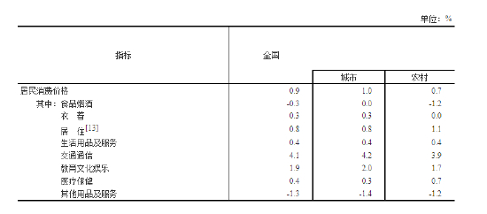 全年居民消费价格比上年上涨0.9%。工业生产者出厂价格上涨8.1%。工业生产者购进价格上涨11.0%。农产品生产者价格[12]下降2.2%。12月份,70个大中城市中,新建商品住宅销售价格同比上涨的城市个数为53个,下降的为17个;二手住宅销售价格同比上涨的城市个数为43个,持平的为1个,下降的为26个。