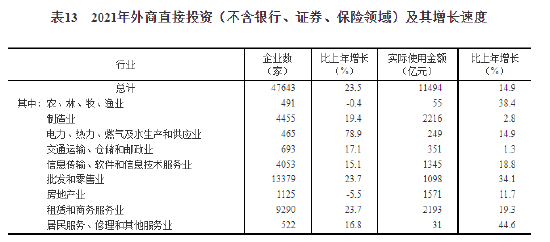 全年外商直接投资(不含银行、证券、保险领域)新设立企业47643家,比上年增长23.5%。实际使用外商直接投资金额11494亿元,增长14.9%,折1735亿美元,增长20.2%。其中“一带一路”沿线国家对华直接投资(含通过部分自由港对华投资)新设立企业5336家,增长24.3%;对华直接投资金额743亿元,增长29.4%,折112亿美元,增长36.0%。全年高技术产业实际使用外资3469亿元,增长17.1%,折522亿美元,增长22.1%。