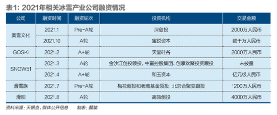 除了备受资金追捧的二级市场冬奥概念股外,不少资本已提前布局一级市场,试图在中国滑雪市场分到一杯羹。2021年初至今,与冰雪相关的领域就已实现多笔融资。包括滑雪社交平台GOSKI、单板滑雪品牌奥雪文化、滑雪培训机构SNOW51奥雪文化、滑雪教学连锁机构雪山乐滑雪、滑呗App等冰雪品牌获得千万元、甚至亿元级别的融资。