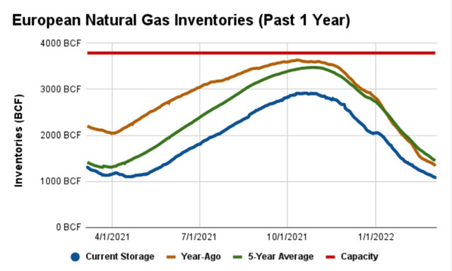 欧洲天然气基础设施网站(GIE)提供的数据显示,3月4日,欧洲当前的天然气库存为1082BCF(BCF为10亿立方英尺),仅为全部库存(4000BCF)的29%,离5年期平均水平还差367BCF。随着此后天气逐渐回暖,这一数据将缓步上升。欧盟希望在今年9月底前,将天然气库存量从目前的29%提升至89%,以使得在下个冬天欧洲能有备无患。