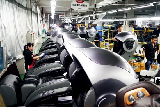 2021年5月19日,温州一家企业内,工人们正在生产出口的按摩器材。图/IC
