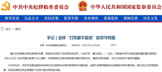 中央纪委国家监委网站3月10日发布一则反腐手记,讲述了河南省开封市纪委监委在对一县政协主席审查调查中,击碎“打死都不能说”的攻守同盟的案例。