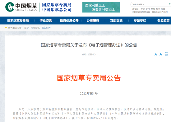国家烟草专卖局发布《电子烟管理办法》 自2022年5月1日起施行