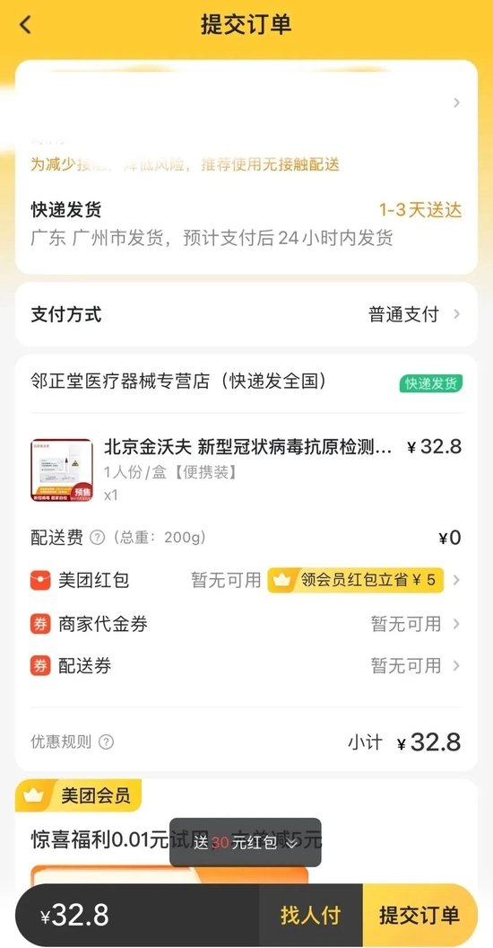 下午1点25分,澎湃新闻记者登录美团外卖app,地址填写上海,搜索“新冠病毒抗原检测”,可直接购买,其中,“北京金沃夫新型冠状病毒(2019-nCoV)抗原检测试剂盒(乳胶法)新冠自测盒试纸核酸1人份”,价格为32.8元,25人份家庭装为798元(单价31.92元),1-3天送达,支付后24小时发货。
