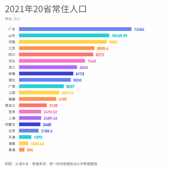 20个省份中,常住人口数超过1亿的,依然是广东和山东这两个人口大省。广东常住人口超过了1.2亿,山东则在1亿出头。且广东在2021年还保持了60万人的增长。