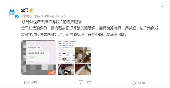 对此,盒马回应称,盒马在售的鳄鱼,是内蒙古正规养殖的暹罗鳄。商品为冷冻品,通过顺丰从产地直发;发货前均经过去内脏处理,正常情况下不存在冬眠、复活的可能。