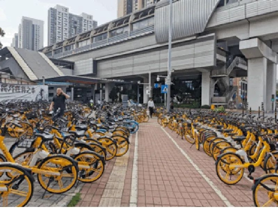 当日,记者在非早高峰时段搭乘深圳地铁4号线,看到车厢内部挤满了人,白石龙地铁站外已停满了共享单车。