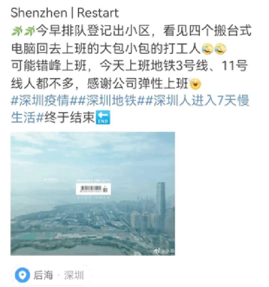 3月21日,深圳地铁公交回复运营产生的盛况,多位深圳市民在社交媒体上感叹道:一个普通的早高峰,终于恢复通车,今儿的天气真不错。