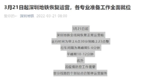 3月21日8点,“深圳地铁”微信公众号发布消息称,当日起,深圳地铁全线网恢复正常运营,运行时间为早上6点30分到晚上23点整,行车间隔为高峰期5-6分钟,平峰期10-12分钟。此外,因疫情防控工作需要,部分线路的个别站点仍暂停运营服务。