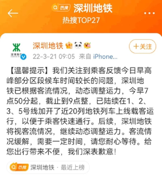 3月21日上午9点,深圳地铁官方微博发布消息称,关注到乘客反馈今日早高峰部分区段候车时间较长的问题,深圳地铁已根据客流情况,动态调整运力。