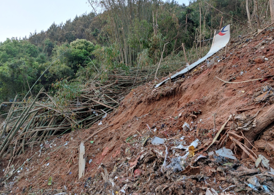 这是3月21日搜救人员在广西藤县坠机现场发现的飞机残骸