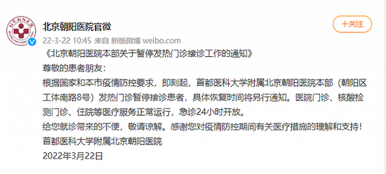 3月22日,@北京朝阳医院官微 发布消息称,即刻起,首都医科大学附属北京朝阳医院本部(朝阳区工体南路8号)发热门诊暂停接诊患者。具体恢复时间将另行通知。医院门诊、核酸检测门诊、住院等医疗服务正常运行,急诊24小时开放。