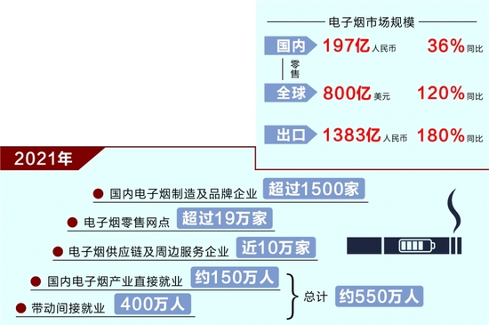 据电子烟行业委员会统计,2021年,国内电子烟制造及品牌企业超过1500家,电子烟零售网点超过19万家,电子烟供应链及周边服务企业近10万家。国内电子烟产业直接就业约150万人,带动间接就业400万人,总计约550万人。
