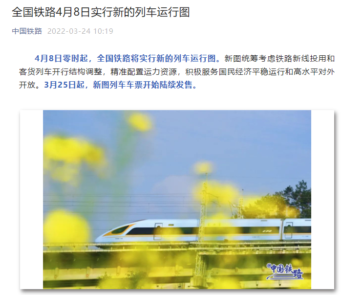 刚刚,“中国铁路”微信公众号发布消息,4月8日零时起,全国铁路将实行新的列车运行图。新图统筹考虑铁路新线投用和客货列车开行结构调整,精准配置运力资源,积极服务国民经济平稳运行和高水平对外开放。3月25日起,新图列车车票开始陆续发售。