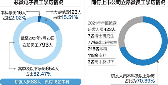 截至2021年9月20日,芯微电子在册员工793人,其中本科学历16人,占比2.02%;大专学历123人,占比15.51%;高中及以下学历654人,占比82.47%。
