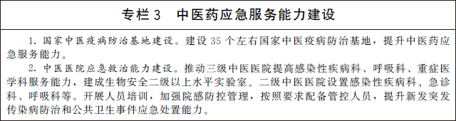 加强中医药应急救治能力建设。依托高水平三级甲等中医医院,建设覆盖所有省份的国家中医疫病防治基地,依托基地组建中医疫病防治队伍,提升中医紧急医学救援能力。三级公立中医医院和中西医结合医院(不含中医专科医院)全部设置发热门诊,加强感染性疾病、急诊、重症、呼吸、检验等相关科室建设,提升服务能力。