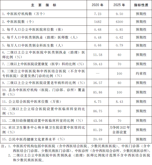 (三)发展目标。到2025年,中医药健康服务能力明显增强,中医药高质量发展政策和体系进一步完善,中医药振兴发展取得积极成效,在健康中国建设中的独特优势得到充分发挥。