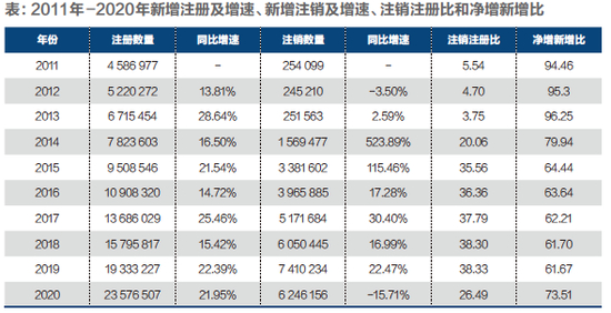 商务部国际贸易经济合作研究院信用研究所3月发布的《中国市场主体发展活力研究报告》显示,2021年中国新增注册市场主体2887万户,同比增长15.42%。同时,今年1月,国家市场监督管理总局登记注册局局长杨红灿在国新办新闻发布会上介绍,2021年全国各类市场主体累计注销1323.8万户,其中,企业349.1万户,个体工商户961.9万户。