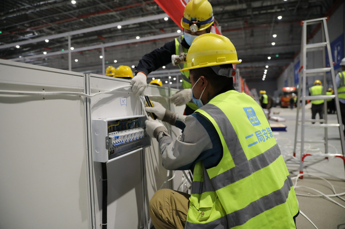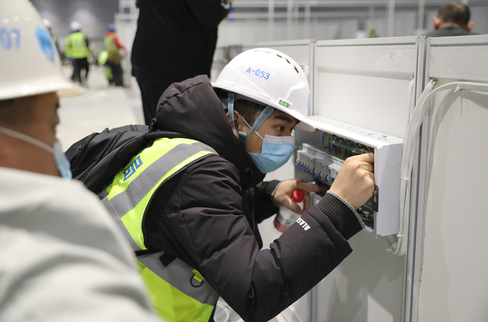 “援建工作工期短,任务重,我们主要负责的是场馆内的水、电、暖,穿线盒、在每个床位侧边接电、安装空调、保证通风……这些事情虽然技术难度不大,但要想做好,不仅要花力气,还要有耐心。”李斌说,一天下来几乎是连轴转的状态,偶然坐下吃口饭,放松一下身体,都会觉得浑身痛。为了提高效率,他常向身边经历过以往方舱建设的前辈们学习经验。
