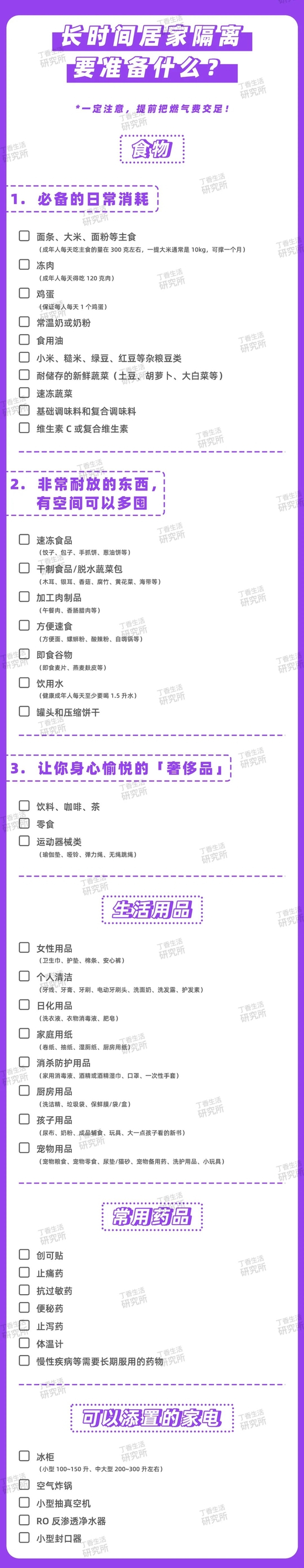 先别慌,我们按照集中隔离、居家隔离两种场景,整理了 2 份不同紧急程度下的物资准备清单,供大家收藏,有备无患。