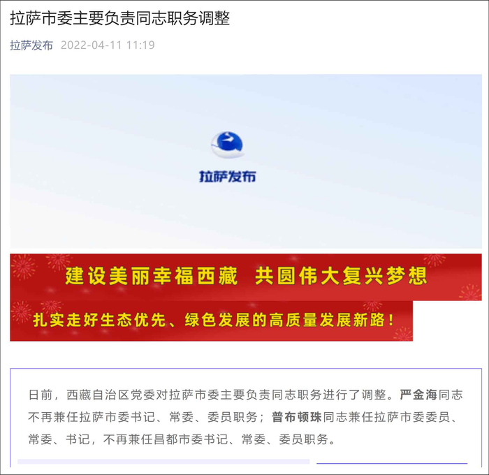 据微信公号“拉萨发布”4月11日消息,日前,西藏自治区党委对拉萨市委主要负责同志职务进行了调整。严金海同志不再兼任拉萨市委书记、常委、委员职务;普布顿珠同志兼任拉萨市委委员、常委、书记,不再兼任昌都市委书记、常委、委员职务。