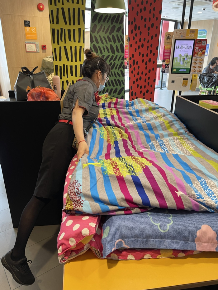 同样,由于肯德基各门店要求闭环管理,确定到岗的工作人员于前一晚办理好相关手续后,便全部搬到店里入住,并且做好防疫工作。