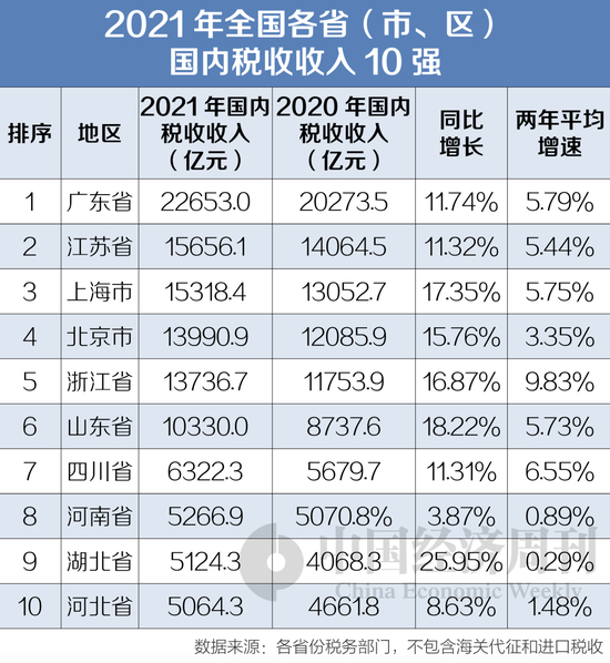 《中国经济周刊》记者梳理发现,2021年国内税收收入过万亿的省份共有6个,分别是:广东、江苏、上海、北京、浙江、山东。其中广东省以22653亿元排名第一位。这个排名与广东省GDP的全国位次相匹配。2021年,广东省以GDP12.44万亿元拔头筹。