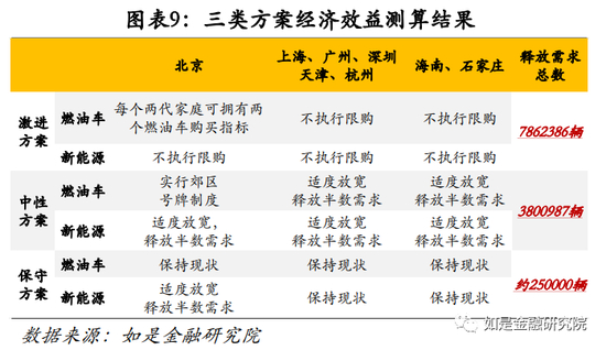3.保守方案:燃油车限购照旧,一定程度放宽新能源购车限制,可释放百亿级别消费