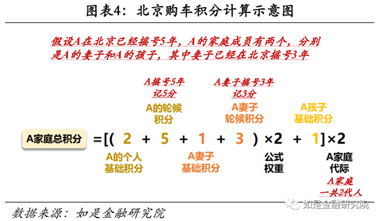 案例二:三世同堂家庭总积分87。假设B是一个在北京摇号5年的人,B的家庭成员有B的老公、B的一个孩子、B的父母总计5人,其中B的老公摇号5年,B的父母没有参与过摇号。那么这一家人的总积分=[(B的基础积分(2分)+B的轮候积分(5分)+B配偶基础积分(1分)+B配偶轮候积分(5分))×2+B的孩子积分(1分)+B的父亲积分(1分)+B的母亲积分(1分)]×家庭代际数(3代)=[(2+5+1+5)×2+1+1+1]×3=87,B家庭的购车难度明显比A家庭购车难度低。
