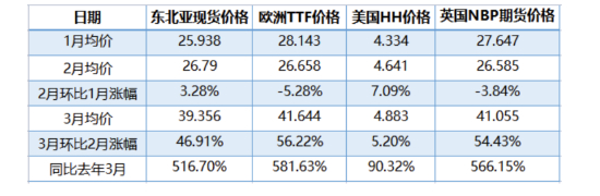 据金联创数据,3月东北亚现货价格均价为39.356美元/百万英热,较2月环比上涨46.94%,受俄乌冲突影响,于3月7日飙涨至84.762美元/百万英热,刷新历史纪录;3月欧洲TTF价格均价为41.644美元/百万英热,较2月环比上涨56.22%,于3月8日创造历史高点,67.925美元/百万英热;3月英国NBP期货价格均价为41.055美元/百万英热,较2月环比上涨54.43%,于3月7日创造新的历史高点,为70.695美元/百万英热。同比去年3月,东北亚现货价格、欧洲TTF价格及英国NBP期货价格涨幅高达5倍之多。