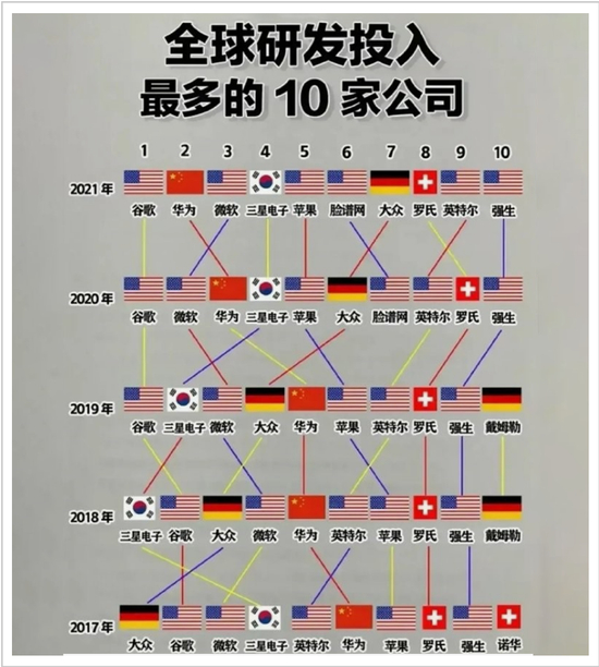 然而,这份榜单却也道出了许多无奈。全世界研发投入最多的10家企业,有一半是美国企业,华为是唯一上榜的中国企业。