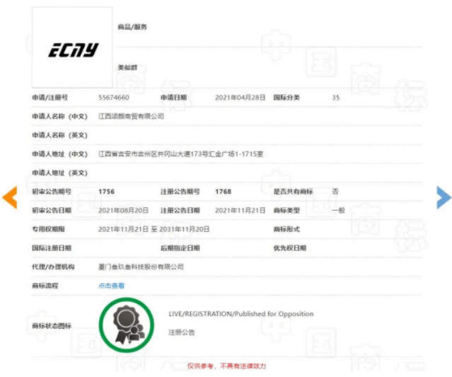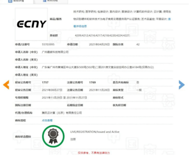 据悉,2018 年 3 月 9 日以来,自然人胡志严在第 36 类,呼伦贝尔首善投资管理有限公司在第 3 类、第 9 类、第 25 类、第 35 类、第 36 类、第 41 类、第 42 类和第 43 类,广州米盘街网络科技有限公司在第 3 类、第 9 类、第 18 类、第 20 类、第 25 类、第 33 类、第 35 类、第 36 类、第 38 类、第 42 类和第 43 类,大兴安岭星光大道食品有限公司在第 29 类和第 32 类,福州旗盛医药科技有限公司在第 11 类、第 12 类、第 18 类、第 30 类和第 33 类,时技科投资发展(深圳)有限公司在第 14 类,江西颂颜商贸有限公司在第 35 类和第 38 类,广州趣家科技有限公司在第 9 类和第 42 类共获准注册“DCEP”“ECNY”“PBCDCEP”等 29 件与数字人民币相关的商标。