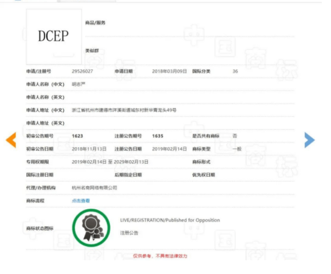 从国家知识产权局商标局官网检索结果看,从 2018 年 3 月起,有数十个包含“DCEP”字样的商标被注册,其中 2019 年注册的商标就有约 60 个。在被标注“无效”的商标页面中,有“申请被驳回、不予受理等,该商标已失效”的说明;在检索页面,也有“仅供参考,不具有法律效力”的提示。