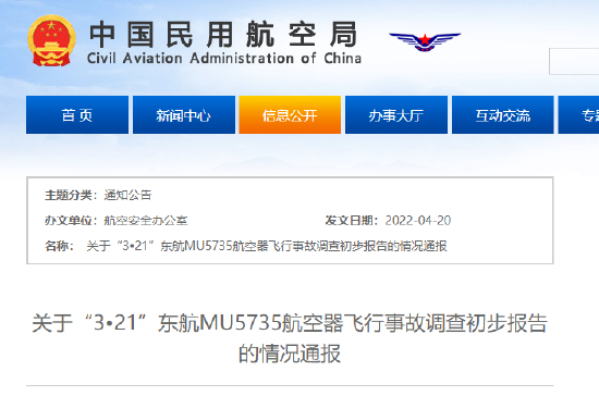 民航局发布关于“3•21”东航MU5735航空器飞行事故调查初步报告的情况通报