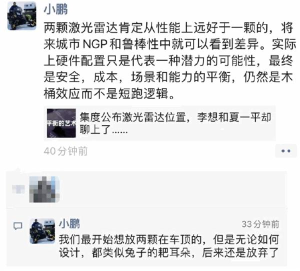 双方的讨论随着之后何小鹏的加入变得更加有意思起来。何小鹏直言:“两颗激光雷达肯定从性能上远好于一颗的,将来城市NGP和鲁棒性中就可以看到差异。实际上硬件配置只是代表一种潜力的可能性,最终是安全,成本,场景和能力的平衡,仍然是木桶效应而不是短跑逻辑。”何小鹏还透露:“我们最开始想放两颗在车顶的,但是无论如何设计,都类似兔子的耙耳朵,后来还是放弃了。”