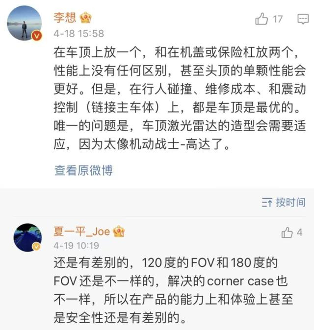 隔日,李想又发微博表示:“量产的时候,激光雷达并不会布置在图片所示的机盖位置上,应该只是试验车的摆放位置。如果前部采用2-3颗激光雷达,大概率会布置在保险杠和翼子板上,风阻和造型都会更好,虽然成本更高。”李想甚至表示:“按照目前这个位置,最新的行人碰撞法规这一关过不了。”